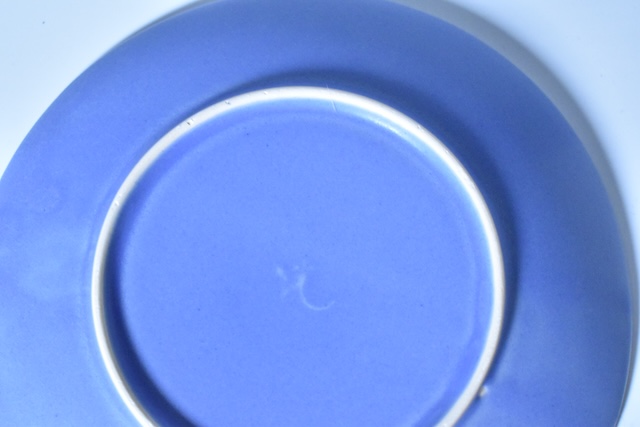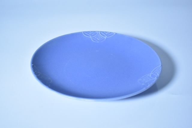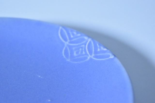 淵に3つの七宝文様を配した表面に貫入が入ったパステルのマット釉がかわいいお皿です。