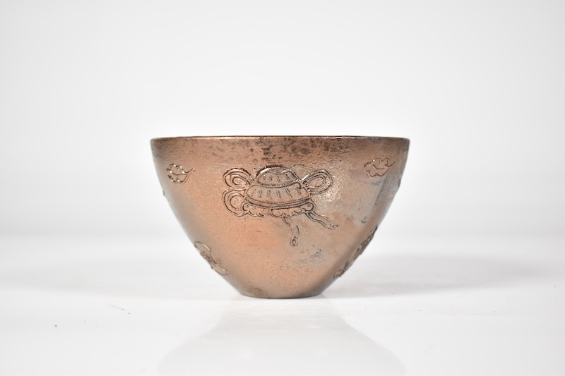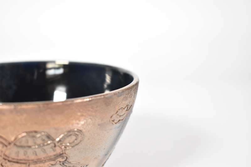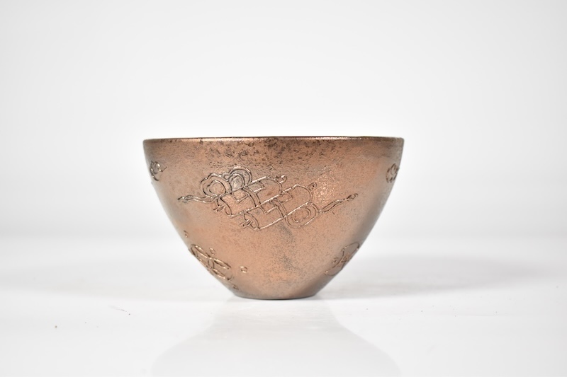 いっちんで宝尽くし文様を施し、全体を銅彩で仕上げた豪華な茶碗です。