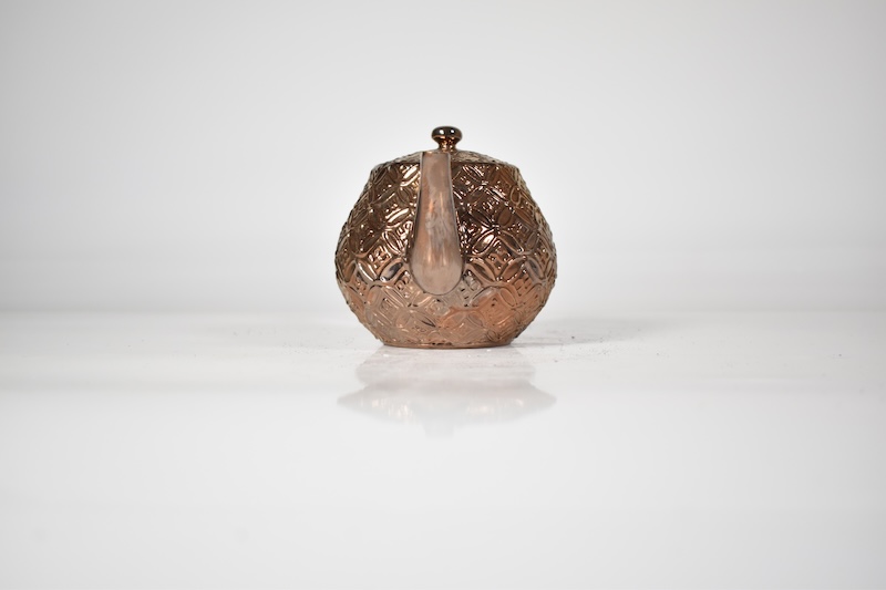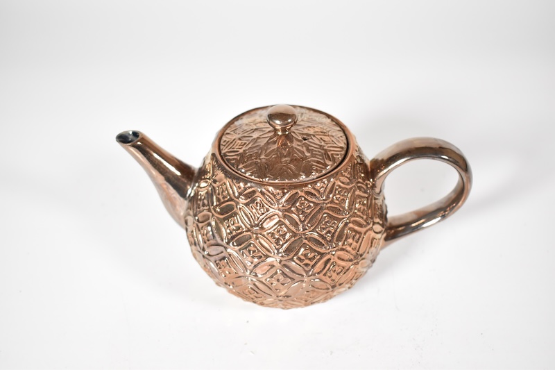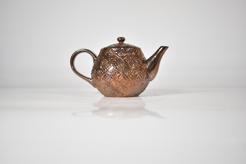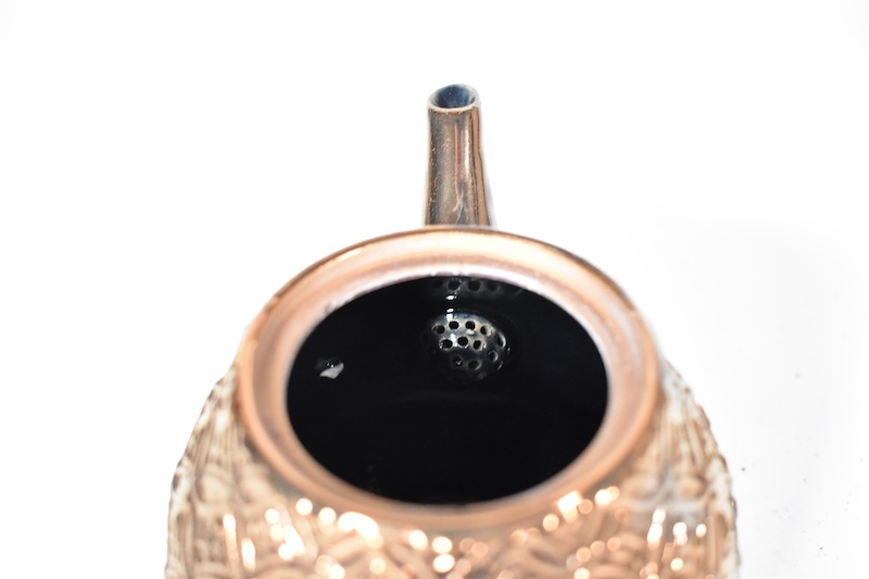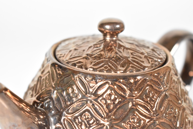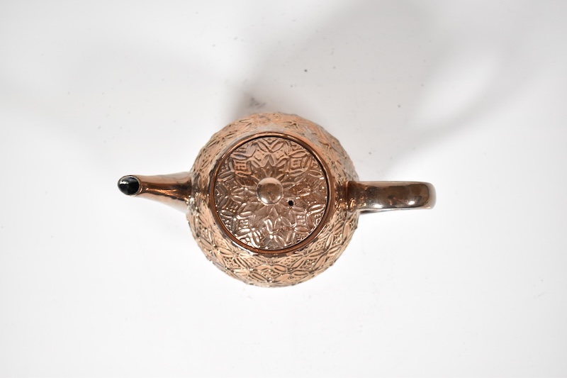 ポット全体に七宝紋様を装飾し、全面を銅で覆うように彩色した豪華な一品です。