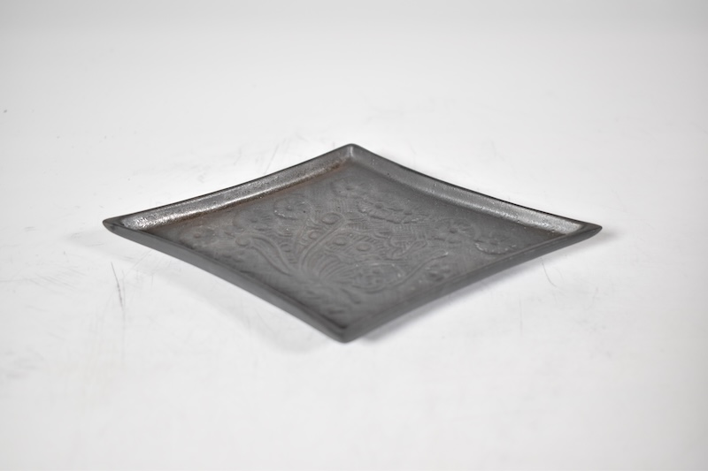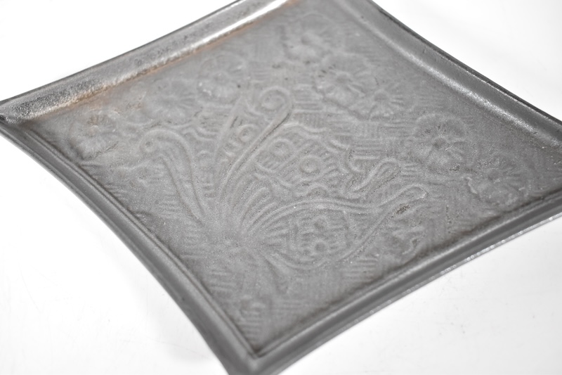 青銅器や石器を思わせる艶消しの釉薬からほのかに浮き上がる彫文様が美しいお皿です。