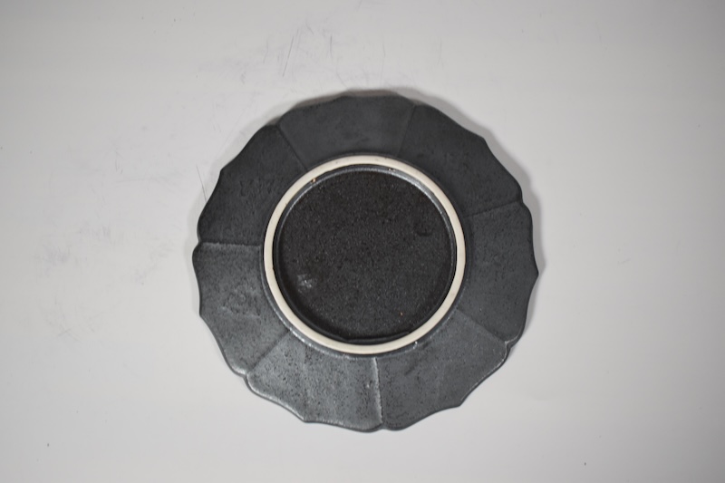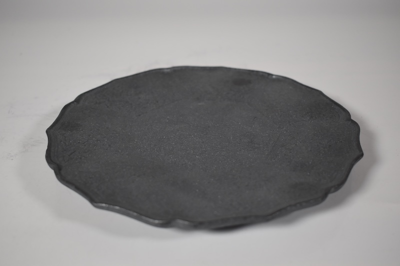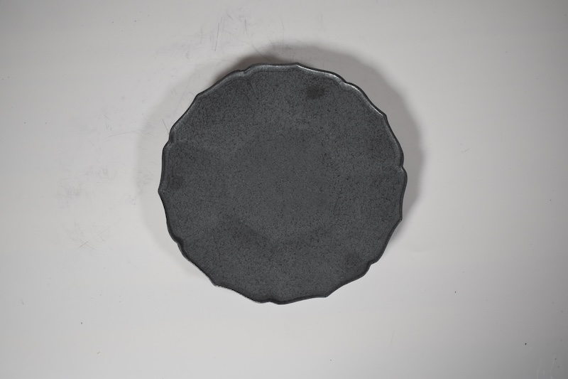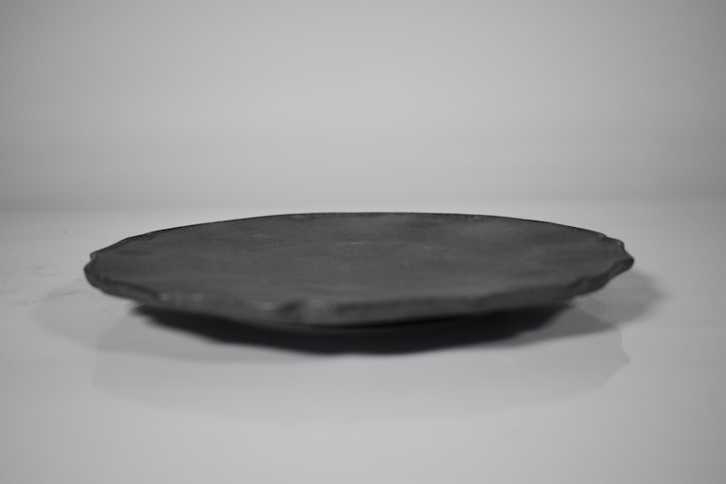 青銅器や石器を思わせる艶消しの釉薬からほのかに浮き上がる彫文様が美しいお皿で、日々の器としても使いやすいサイズです。